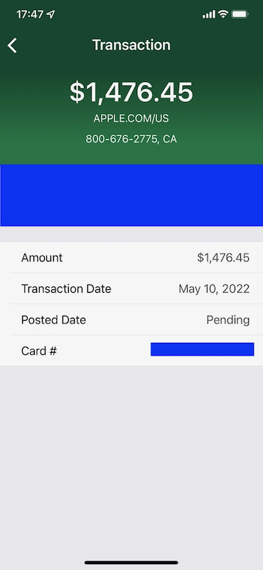 In the normal course, the "Posted Date" field would change in the next 24-48 hours from "Pending" to the date that the charge is posted, either May 11 or May 12, 2022.