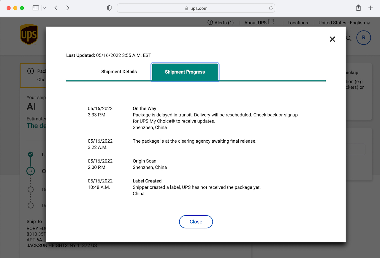 May 14 sometime before 6PM in Shenzhen: "Preparing to Ship"