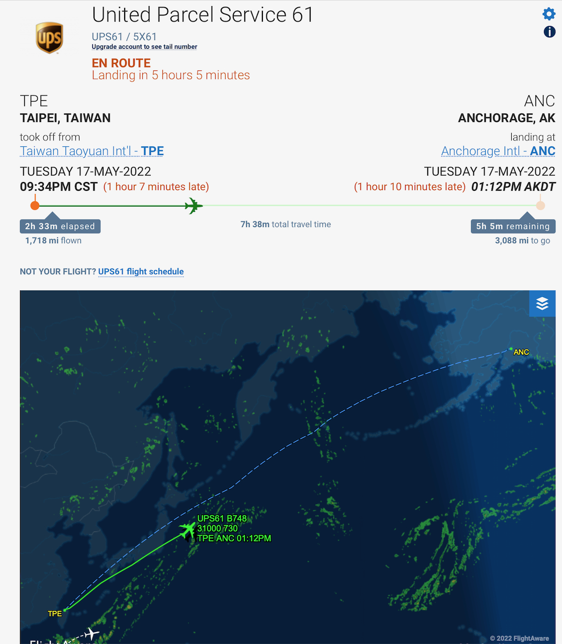 Link to the Flight Aware live page below: https://flightaware.com/live/flight/UPS61/history/20220517/1210Z/RCTP/PANC