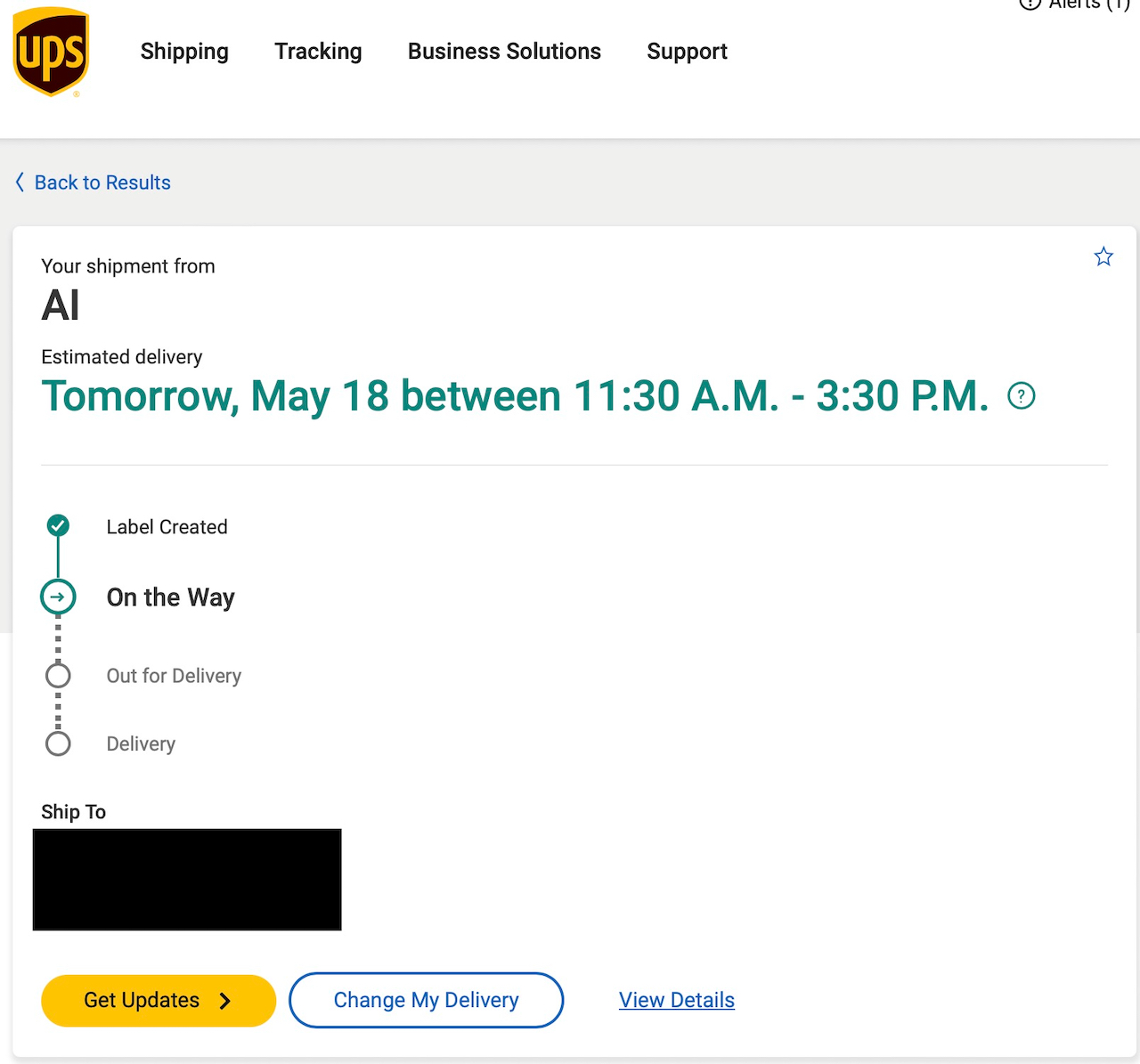 Estimated deliveryI inform you that UPS informs me that the package will arrive on Tuesday, May 17 between 8:45 a.m. and 11:45 a.m. Except that in Paris it is Tuesday, May 17 and it is 10:30 p.m.😄