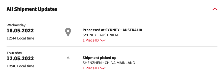 After almost a week, my Max has landed in Sydney! No tracking details between China and Sydney. Next Stop... Brisbane! Strangely, the DHL Express tracking page doesn't display an expected date of delivery. But so pumped it's finally on Australian soil. No long to go now!