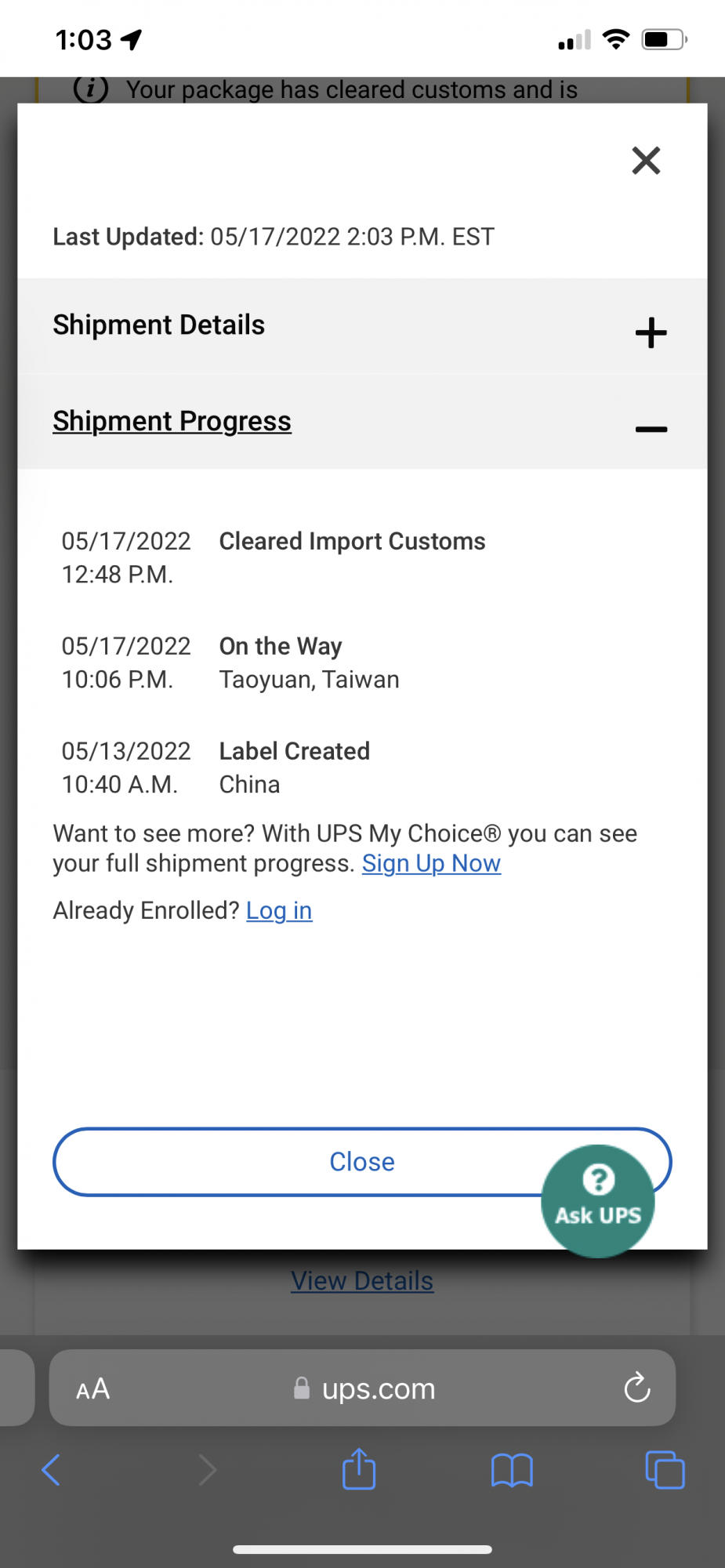 If I recall correctly, the standard UPS page doesn't show departures, but UPS My Choice (free to register) does. The odds are that your order has now departed Taiwan and is on flight UPS61. As the capture below shows, the flight is currently on its way to Anchorage and is scheduled to arrive just after 1PM local time. Anchorage customs clearance appears to be quick, and flight time from Anchorage to Louisville is about 6 hours. No problem getting your order to Louisville tonight. Then it's Louisville to wherever you're located.