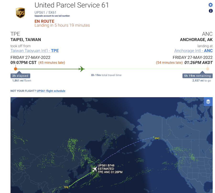 If UPS Tracking has a departure time for Taiwan that differs by an hour or so, the below, which is live, is correct, and UPS's tracking is wrong. I noticed on my own UPS Tracking that UPS initially showed the right departure time and then changed it to a later time that was incorrect. If I recall, it did the same thing for the Anchorage departure. Don't know what that's about.