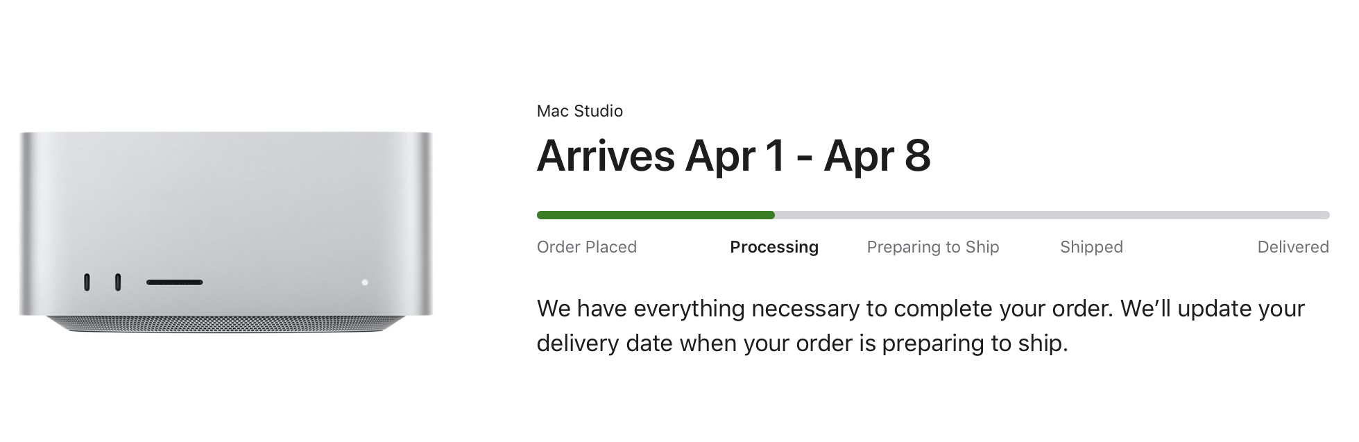 Mine went from 21-24 March to 1-5 April as well. Entry-level with 1 TB upgrade. Mine hasn't been preparing to ship at any point though.Wow my status went one step back. 😢 I'm back at "Processing". And my delivery date slipped from 21. - 23. March to 1. - 5. April. 😳