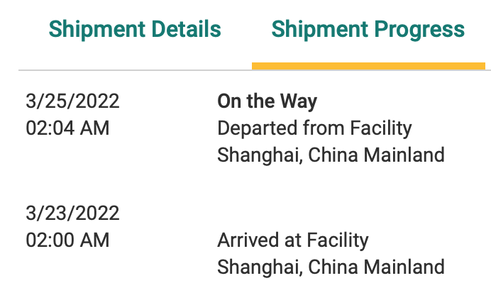 I’m now showing a departure scan out of Shanghai - 3/25/2022 2:04AM (just over 48 hours after the prior Shanghai departure/arrival). Delivery still “scheduled” for Monday (previously today).