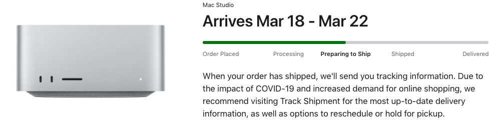 My order switched over to Preparing to Ship this morningUltra/20 CPU cores/64 Gfx cores/128 GB/4 TB