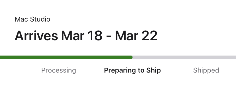I ordered the M1 Max 10/32 with 32GB RAM and a 1TB drive, ordered late in the day when it was released, I swear I had an earlier delivery date, March 20 something if memory serves, they now have it at March 31-April 7. Ordered the keyboard too and that came today. I'm actually buying this to replace one of the new M1 iMacs that was very disappointing after my experience with an 8GB M1 Macbook pro. More beach balls then I get on my laptop which has half the RAM. Been fighting with this machine since it came, Migration Assistant, left stuff out and messed permissions up, it was so bad I did a fresh install of everything with marginal improvement. The Studio is more in-line with what I've been using (2013 trashcan). I work in print, so figured that the iMac M1 would be overkill but both Photoshop and InDesign run better on my laptop. You can't even get an accurate trade in price as it limits the drive size choices for the iMac to 512GB, and at 512GB they are offering $880.00 (US) for a machine I recently paid over $2k for, eBay it is. Truly hope the Studio lives up to the hype, from the interest and orders, they seem to have hit on a machine that is a suitable replacement for an older mac Pro without the need to see the Apple mortgage people (they must have one for the current pro). Putting off starting on the 3 book design jobs I have in the cue until the Studio gets here, fingers crossed.