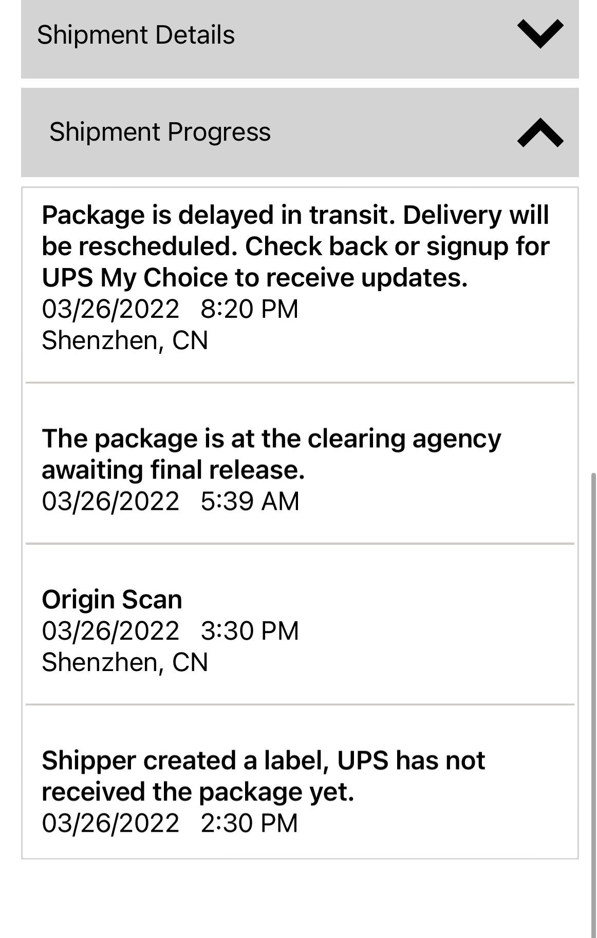 Mine's in delivery delayed too (Apple thinks the 4th for delivery), but I had some Lenovo Laptops that arrived this week and they went through the whole same process. I think Shenzhen is having some infrastructure problems still from Covid. It turned out we received the laptops 2 days before Lenovo said they would be there and UPS only noticed that the day before we got them. Maybe UPS is having timing problems too!I wonder why the shipments are being held for so long in China. Apple and UPS have usually been really good about getting things through in 24 hours.