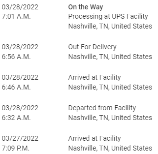 Just chiming in as well. Apple quotes a delivery date of April 4. UPS quotes a delivery date of March 29. There's been no updates since March 26 at 10:15pm where the last status is "On the Way" Shanghai, China.