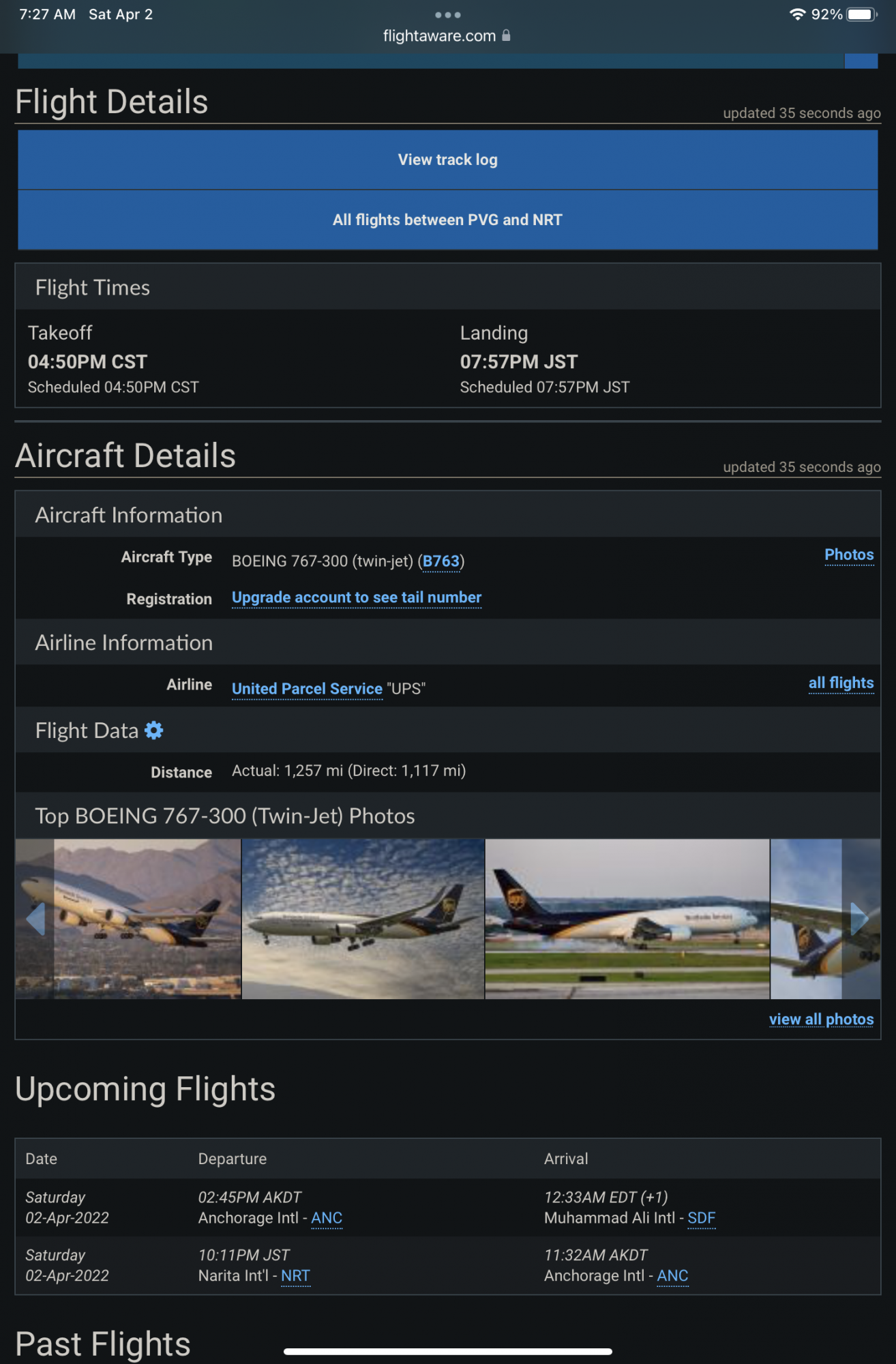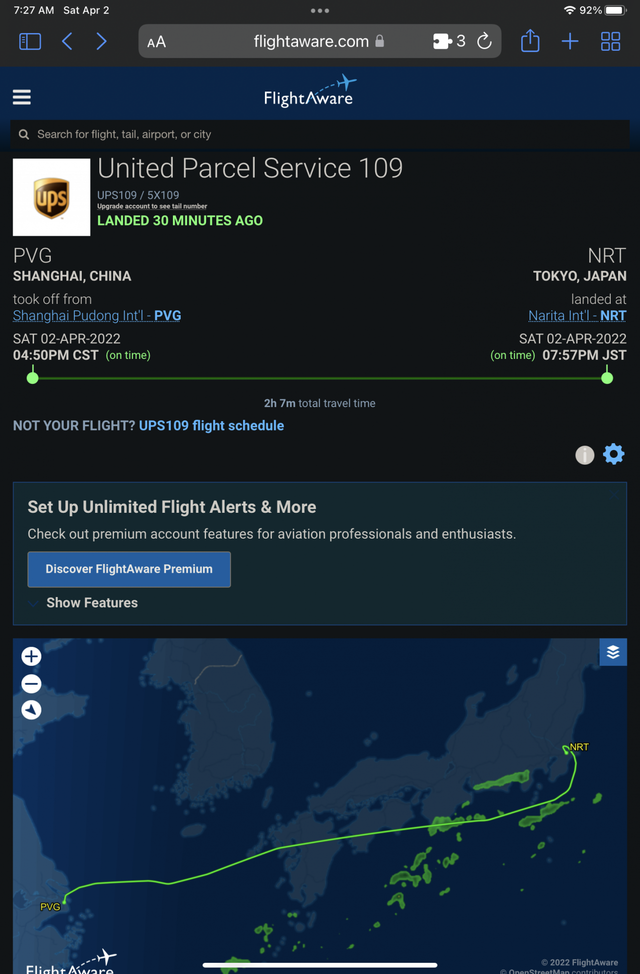 I'm not thinking this is my Studio as when I'm on the UPS My Choice I still get theLooks like we’re on UPS 109 from Shanghai. Oddly enough, it says it’s going to Japan and not Korea, which gives me a bit of uncertainty that this is actually it. But the times and subsequent destinations match perfectly. If this holds true, we should be in Louisville by Sunday morning (see the “Upcoming Flights” section at the bottom of the second screenshot).
