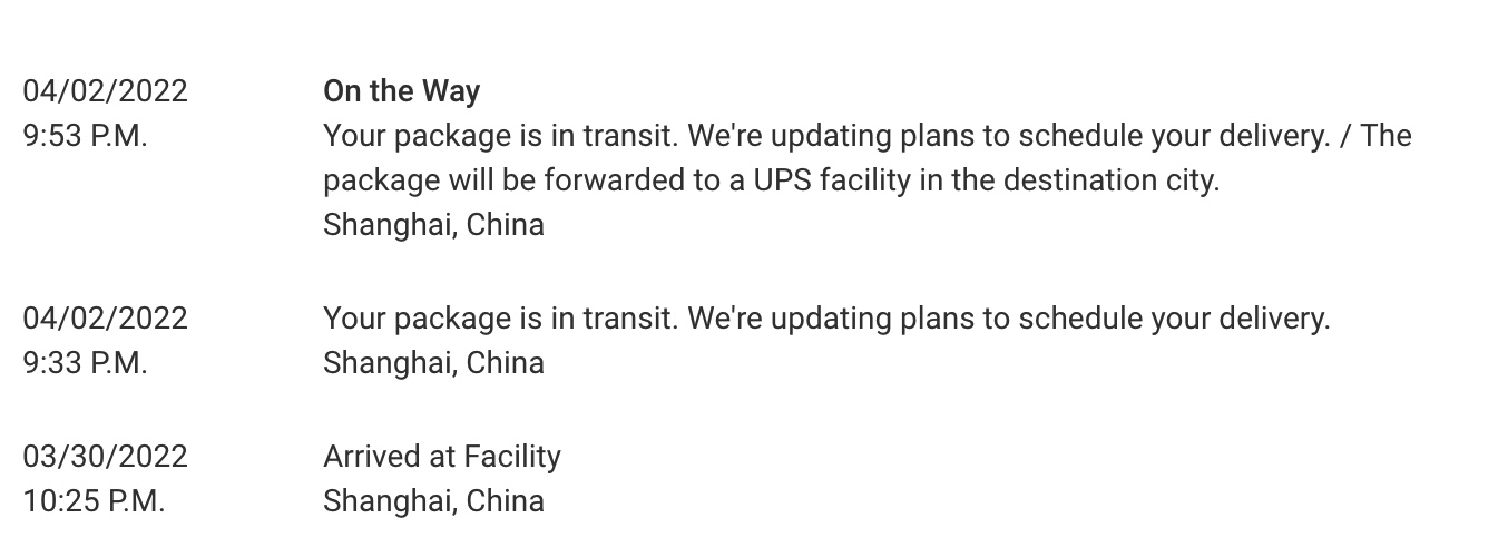 My delivery date is still Tuesday but it left a facility in Shanghai and hasn’t reappeared anywhere yet