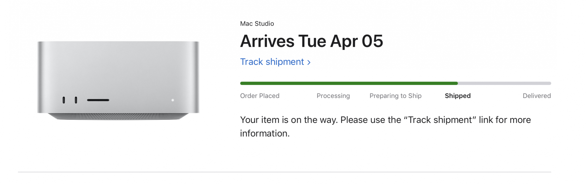 Awesome my 3/31 - 4/7 Studio Display is still stuck in preparing to ship. Luckily I found one local that's the same spec as what I'm waiting on. I pick it up in a couple of hours.Woohoo! Just got the email from Apple that my Studio Display has shipped and will deliver by Thursday, April 7. The tracking number hasn't shown up on the UPS website yet, but this is a step in the right direction.