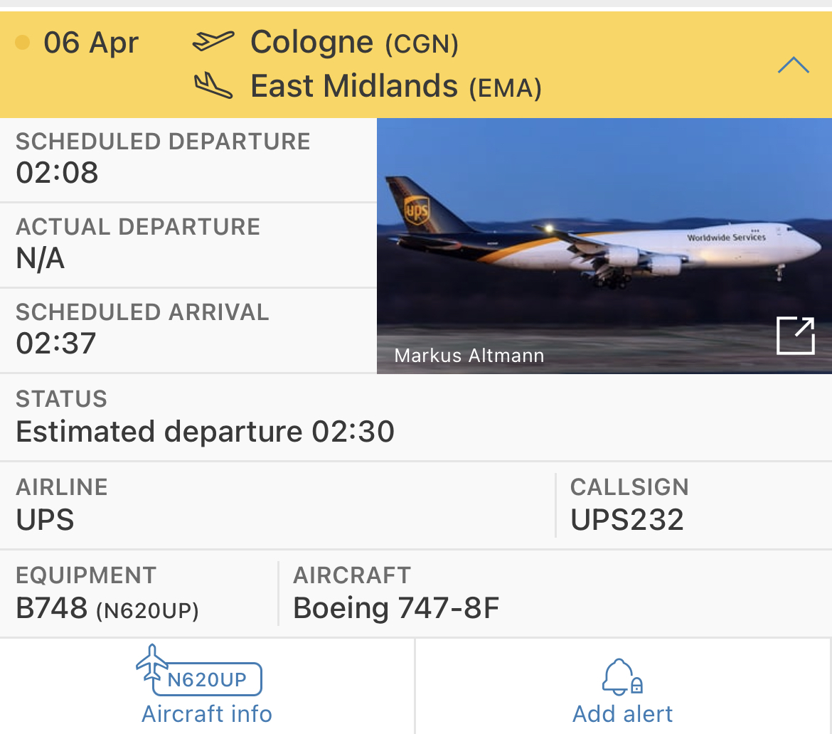 Yep just checked for flights from CGN, and there’s nothing. It could be a truck though…UPS232 left Cologne this morning without our Studios! But UPS shows mine has just left Cologne: