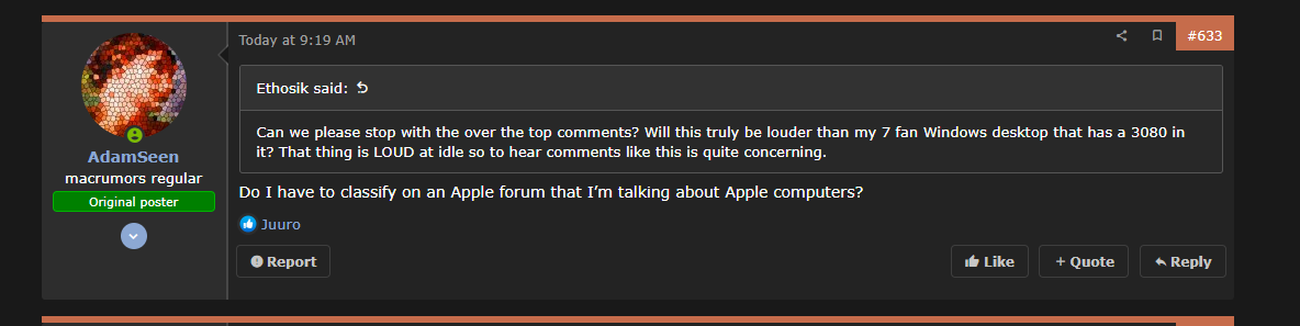 Unless you went back and edited the post I quoted, you said loudest computers in recent history. Not loudest mac, but loudest computers. If you keep repeating it, be sure to make it clear you are speaking about macs. This post is 26 pages and has been active for some time. I don’t scan all 26 pages every time there is a reply.