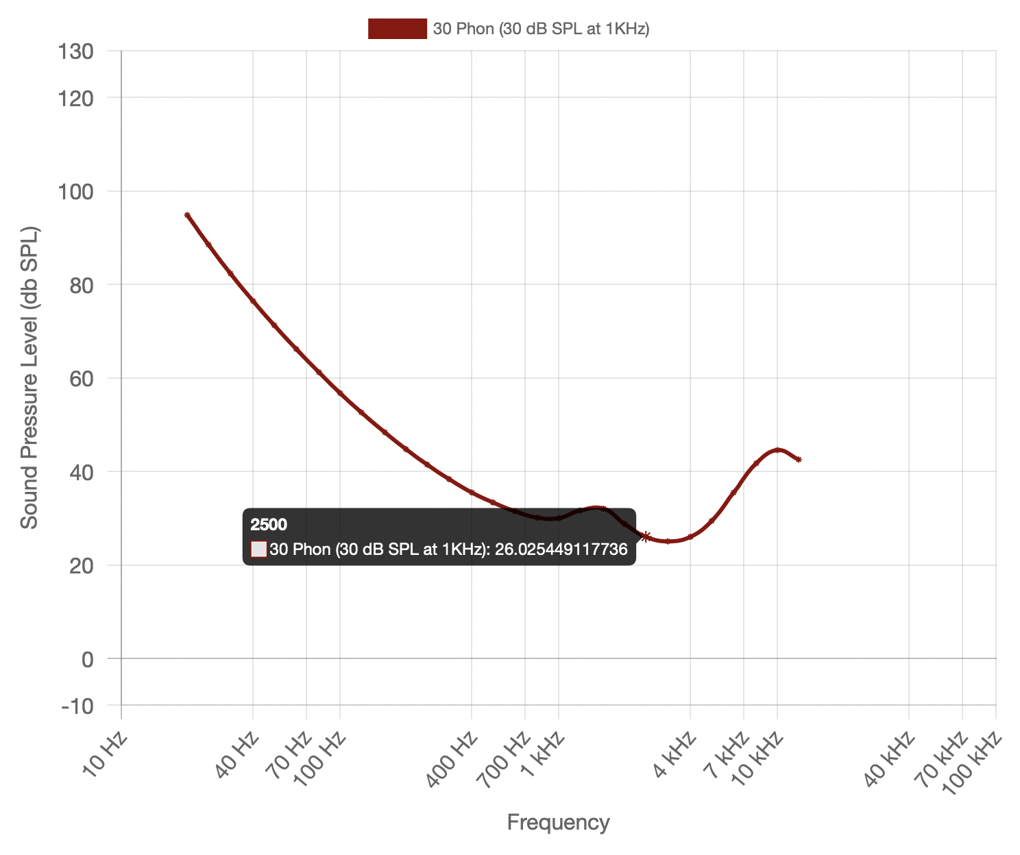 The highlighted point is 2500hz, which corresponds to 26 dB. This is basically where the whistle on my Mac Studio sits. It happens to be basically the frequency that human hearing is most sensitive to.