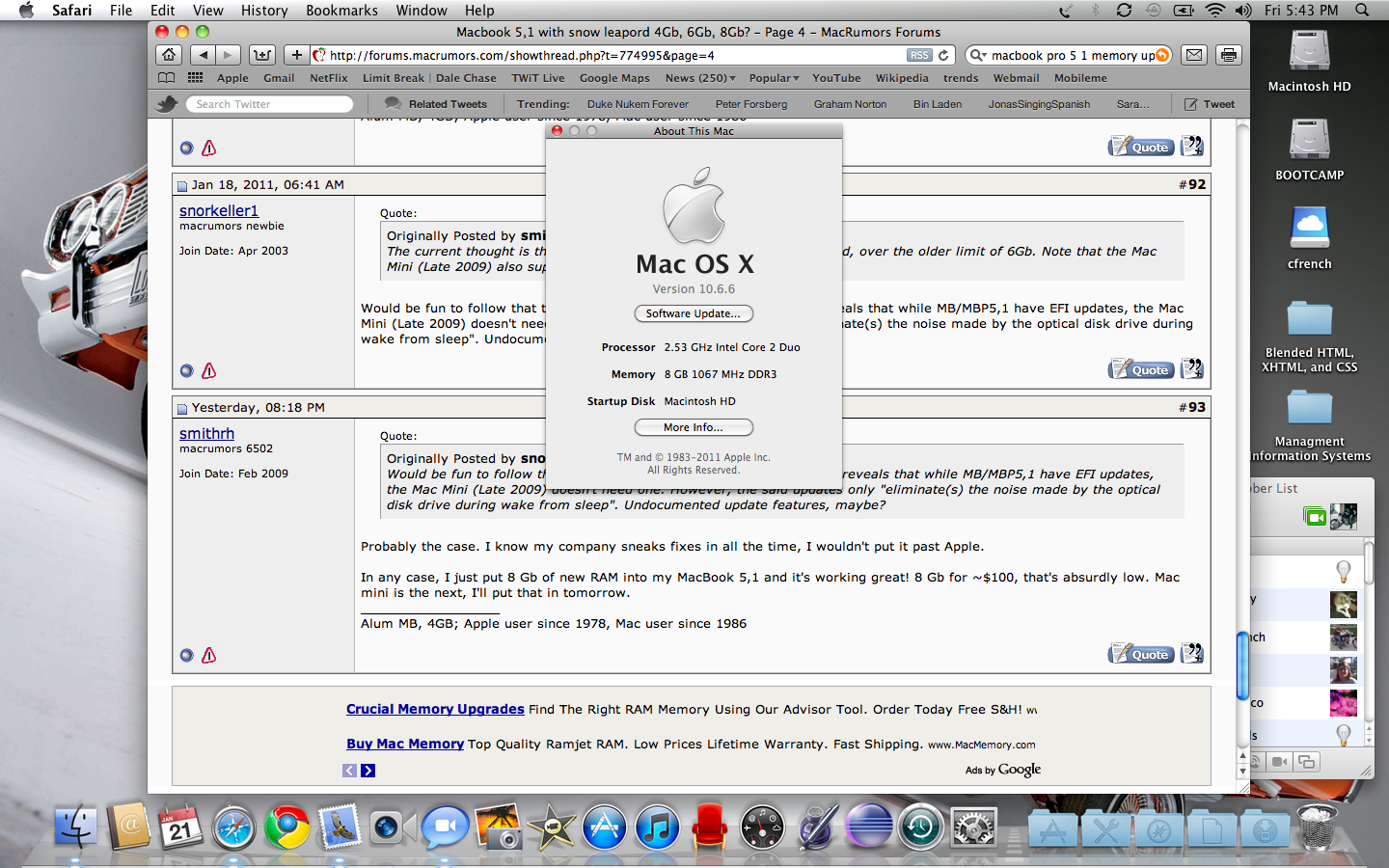 Can you post the exact specs of the Crucial DIMMs you used? If you are inclined can you post the vendor too? I want to compare prices with OWC and consider this upgrade for my MBP 5,1
