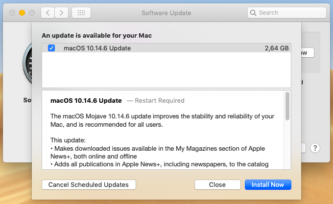 - an update available for my Mac: "macOS 10.14.6 Update", taking up 2,64 GB and ready to install (apparently it had been downloaded in the background without my knowledge); and