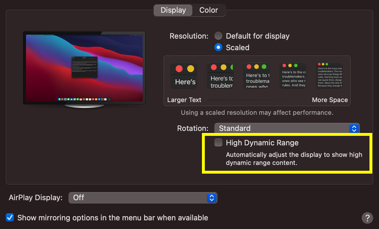 Hello all, my new MacBook Air m1 (1TB,16GB) is about to be returned unless someone on macrumors can throw me (and probably others) a Hail Mary. I am having continued issues with wake from sleep (since 11.0) and as of 11.1, I'm now having strange coloration issues. My setup is a MacBook Air in clam shell <> hyper drive usb-c 4k 60hz adapter <> Dell 4k 32" monitor. when the monitor is open, there are no coloration issues.