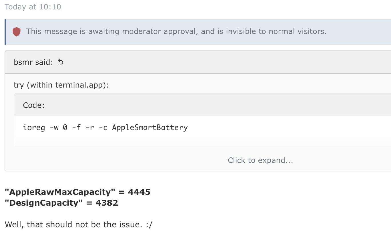 This shows me 100%. Ok, I understand that a 3rd party app like coconut may have some false numbers, but the terminal should give me the correct numbers... it seems that coconut gets is data from the same source as terminal ioreg input... strangeIf you go into System Information | Power you will see 100%, I've had my MaxCapacity change various readings but Sys info always reports 100%
