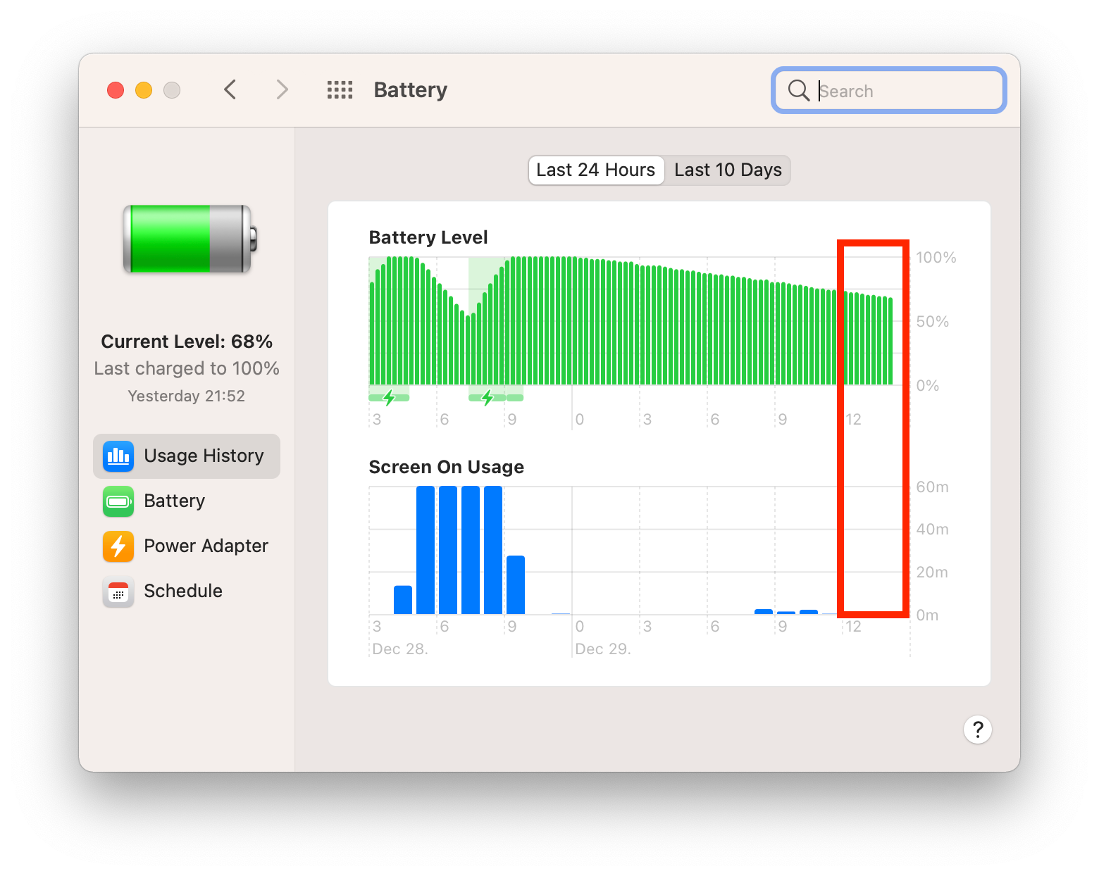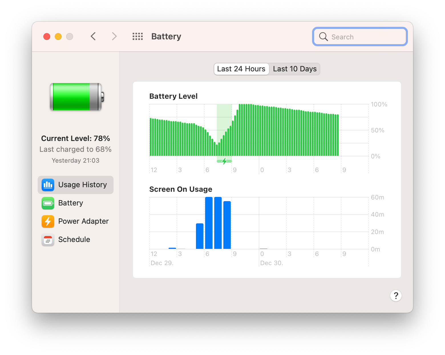 Also, this System Prefs pane shows "Last charged to 68%", which is false. The machine was turned off while charging.![]()