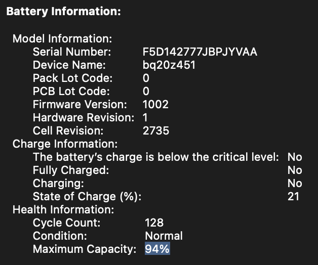 Hello, does anyone know why my battery health is dropping so fast ? I just bought a Macbook Air 2020 M1 around the beginning of December 2021 and until now it's been about 6 months, the information battery health on my MacBook Air's is 94%, why did this happen? i think its realy fast droping. Please share info or share your story, thanks