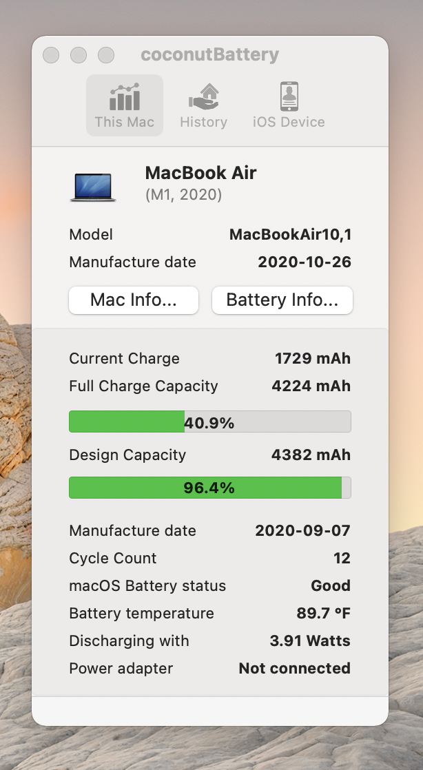 Maybe you're right, I tried to check the battery of my iPad with coconut and with another program. Coconut showed less battery remaining capacity than this other program (I don't remember the name).Just received my MBA M1 today and getting (with battery cycles=1) 98.6% capacity on Coconut Battery (4.322 mAh Current Charge = Full Charge Capacity vs. 4.382 mAh Design Capacity).