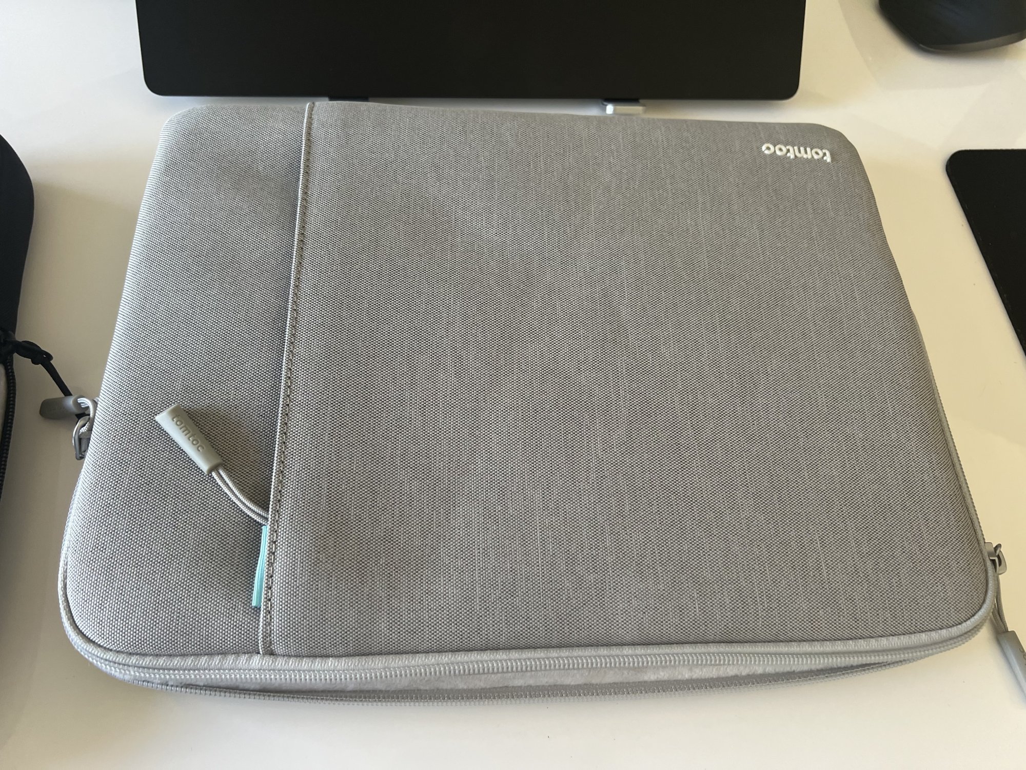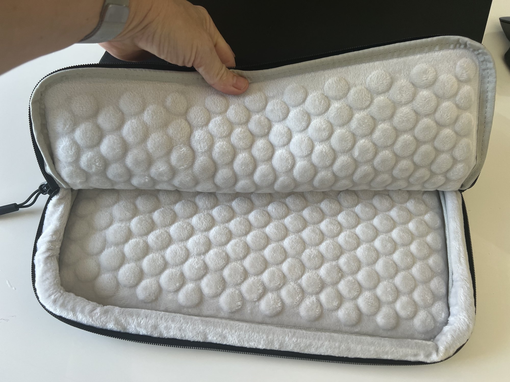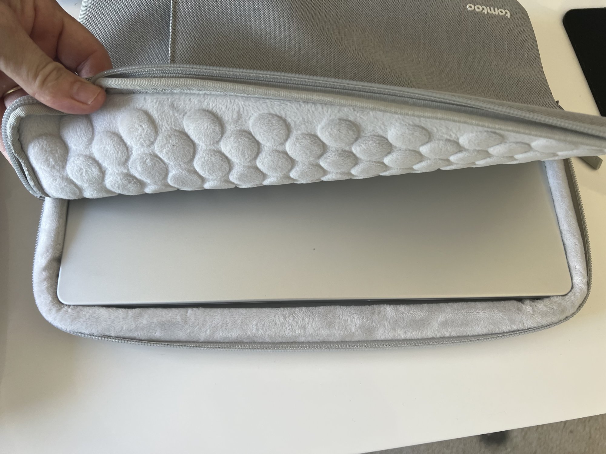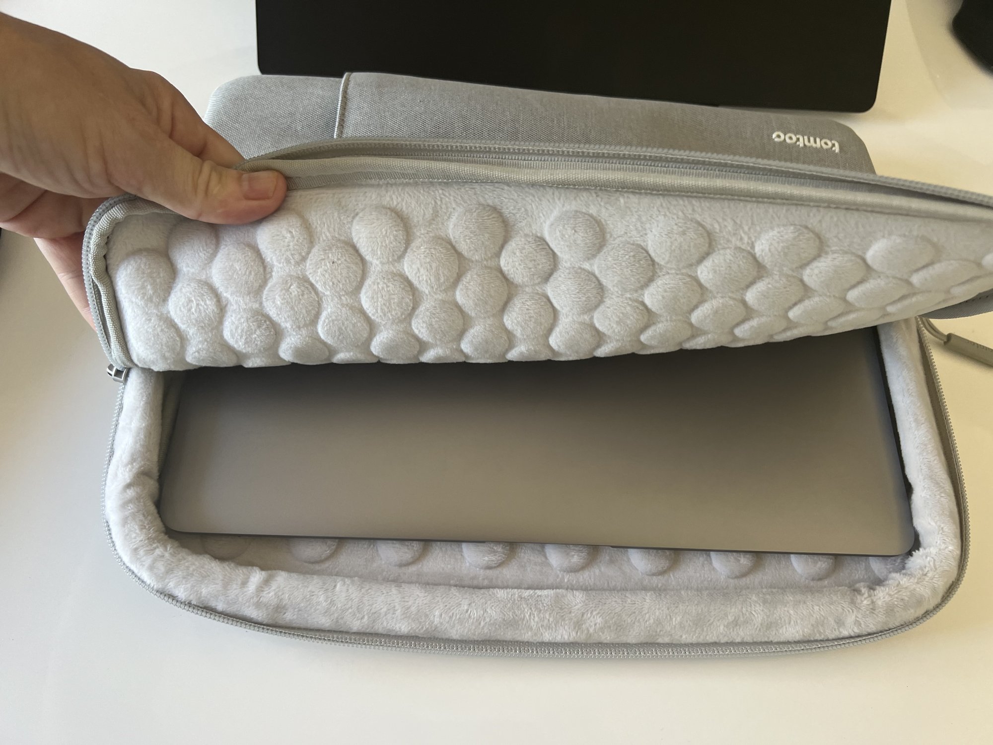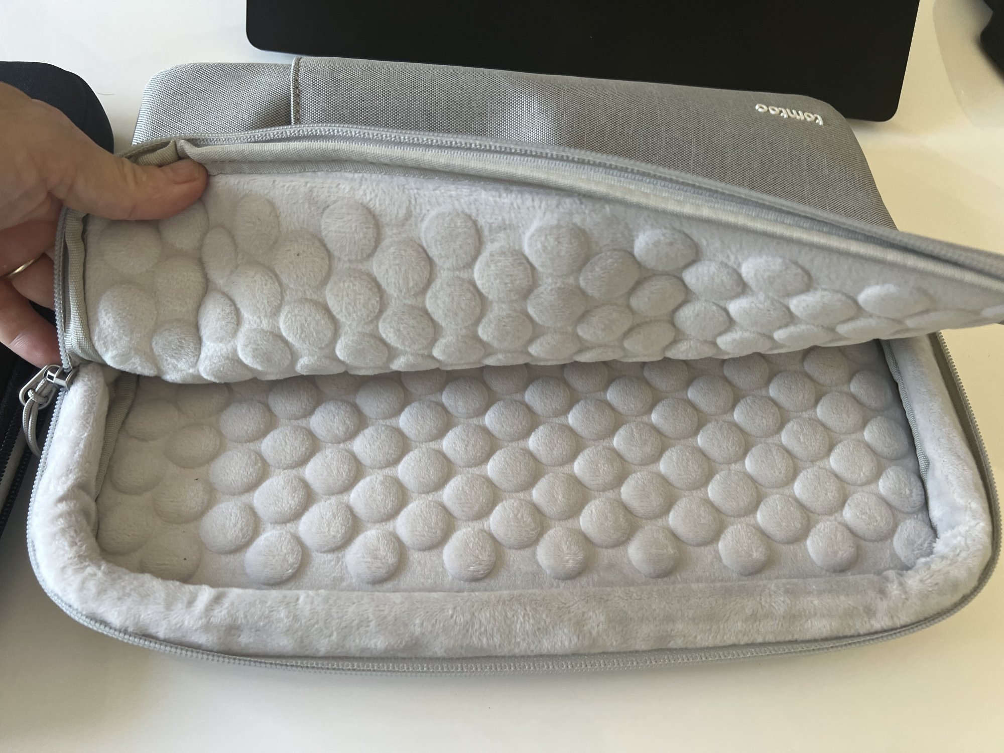 tomtoc has several product lines. Some of the models have 'fur' plus circle pattern on the interior. Some of the models have plain fur -- fur without circles. These products do feel protective. They also are pretty thick.Do you have the grey or black one? Asking because the photos seem to illustrate different linings inside and am wondering if one fits the M2 better than the other. Thanks!