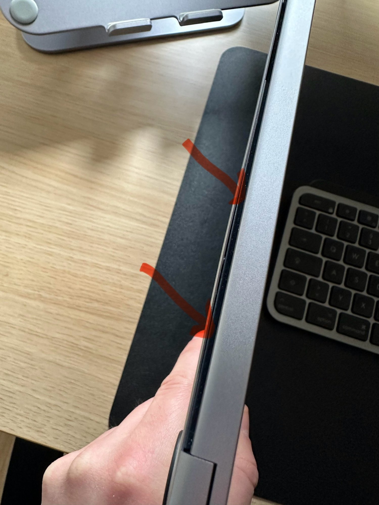 Hello, I bought brand new Macbook Air M3. When I checked if everything is ok, I saw that there was a lot of dust in back part where is the hinge (see photo, photo is just for illustration). Is there anybody with same issue? I vacuumed it and now is ok, but what do you think? The brand new macbook full of dust out of the box. Do you think there should be also inside? Or can be damaged? Thanks
