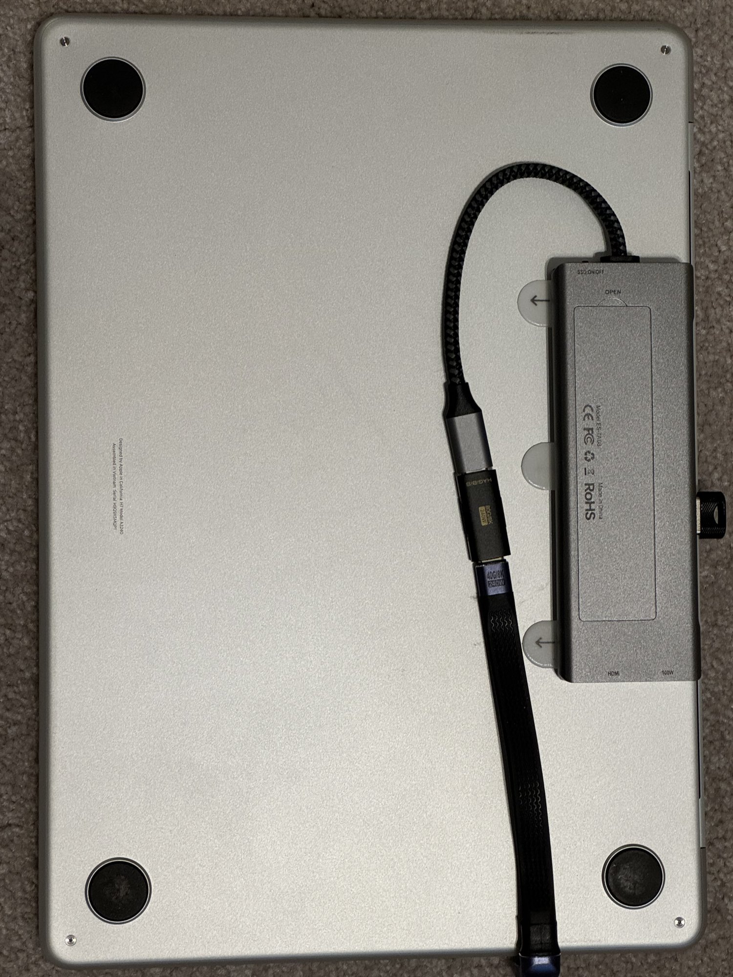 I saw those side mounted hubs didn't like them much. So I cam up with this. I don't have anything to disassemble, it is under the Macbook, nothing pokes out of the side. I can drop in it to a backpack as is.