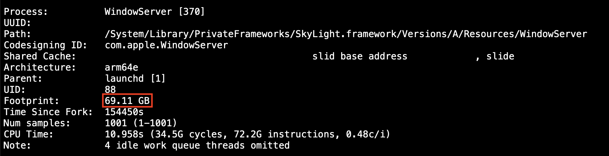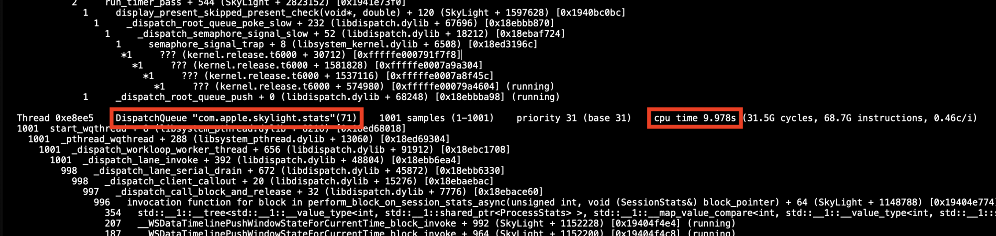 That is a WindowServer stats collection thread that consumed ~10 seconds of CPU time during a 10-second sample — which corresponds to 100% of one core for 10 seconds. Hmmm.