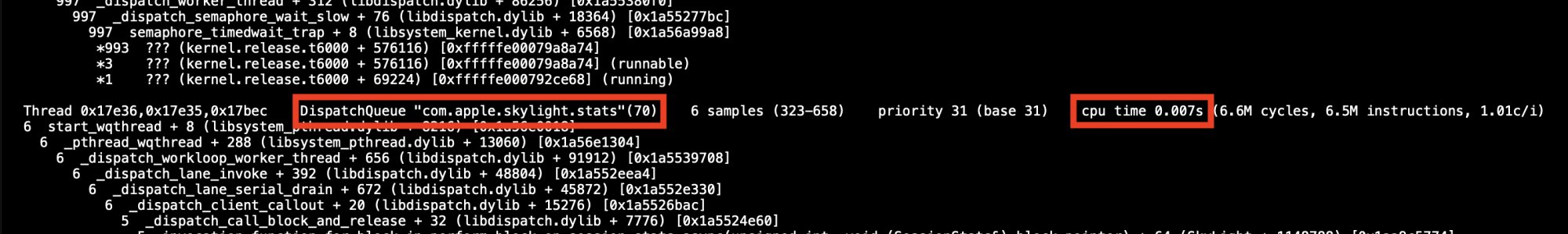 This will collect a 10-second sample of all running processes, with the selected process at the top of the list below the report header. Search for "com.apple.skylight.stats", and check the value reported for cpu time (as highlighted in the screenshots above). A value close to 10s would indicate that the same thread is misbehaving as my example here.