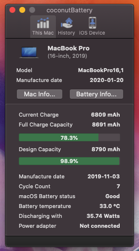 I have my MBP 16" since December. I have lost 2% battery life since then (value from coconut battery) but today I noticed that I have only 87% capacity. I noticed this twice - a few days ago I had the same issue but it was solved by resetting SPM and running my machine in safe mode and charge the battery to full.