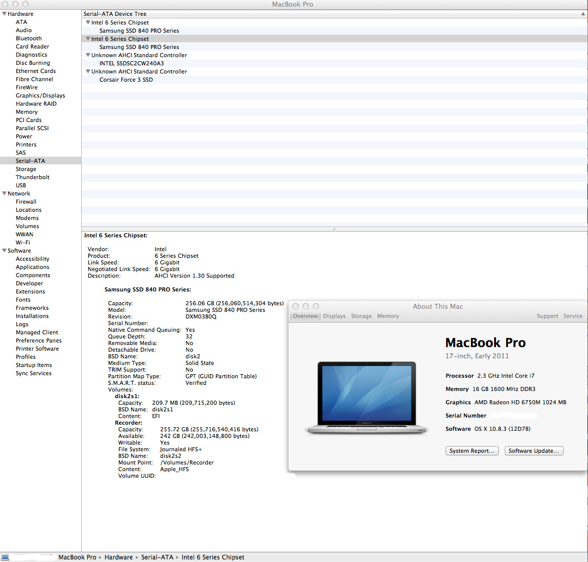 The final test/setup was restoring the Intel 520 in the optical bay with the data from the old RAID0 array and Samsung 840 Pro in the main bay from Mac HD backups on Time Machine (that's now on a FW800 RAID0 enclosure) then do a new Time Machine backup of the new setup. Reopening projects all appear to work. Time Machine, Disk Utility, and Blackmagic Disk Speed Test all appear to work on both SSDs. System Profiler reports negotiated link speeds of 6Gbps for both. It's now been 72h but if all is well at the end of the month, I'll be comfortable sharing photos of the procedure.