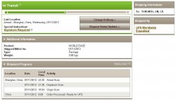 Is yours coming with UPS? I'm in Toronto as well. I had a departure scan on 07/11 at 21:38 so I thought it was on the 21:39 flight but around 3 this afternoon another scan showed up from Shanghai saying 22:30 arrival scan. Do you know how many days it will take to Toronto? My UPS Page doesn't give me an expected delivery date. It's coming with UPS Worldwide Expedited. I wish it were FedEX