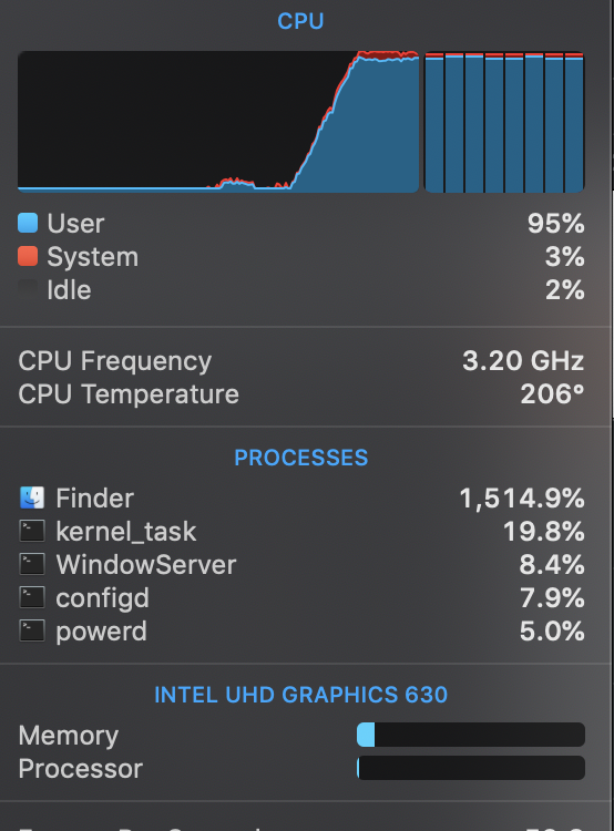 Oh actually Finder was red and unresponsive and spinning beach ball with the fully scrollable rack of compression progress bars in its little cp window. Other apps and things are working fine... at like 1560% CPU. And Finder is red. So Im like ok this thing is locked up. Finder rarely recovers for me in moments like this. So I wait a few moments. The rest of the machine isn't locked up so maybe 5 seconds more... and then all the progress bars shoot to the end, the thing comes completely back to responsiveness, still full CPU utilization, and then the sound of the archive process completing - bong - bong- bong -bong - bong, it was incredible. Like a powerlifter stalling out at the top of a press and finding the will to push through. This is my favorite Mac (out of probably 20) Ive ever owned.