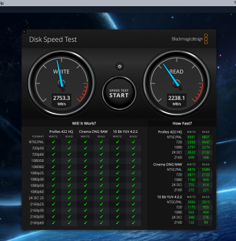 - Blackmagic Speed Test - 2753.3 W/2238.1 R, although my Reads have been as high as 2380.