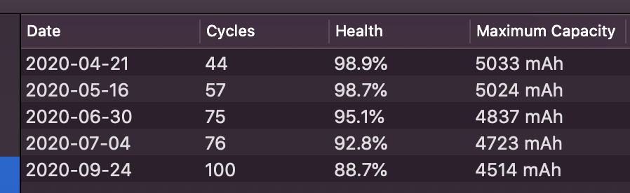 Here are my stats in case anyone wonders if I can backup my words. Only keep the mac plugged in all the time if you are using a charge limiter set to 50-60% (like I am doing). And if you go down that road you definitely need to cycle at least 20-100% ~once a week. I've gone lower than 20% many times and health is still sitting above 99%.