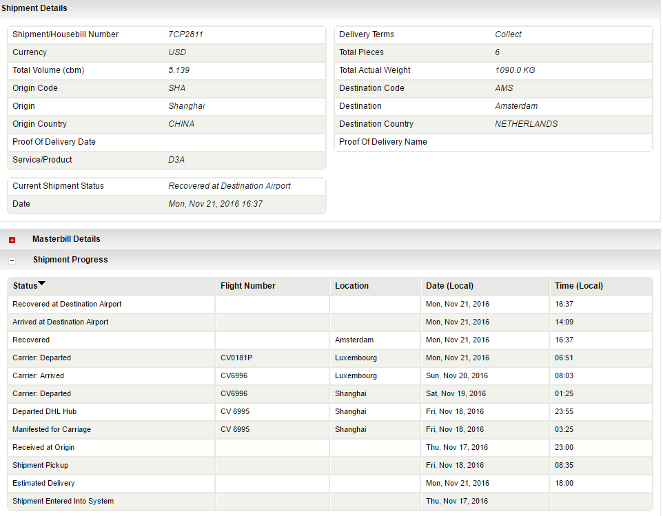 DHL Express CS just told me they will deliver tomorrow from 7:00-17:00. They would not narrow it down. Pickup at their hub would only be possible after their first delivery attempt, but pickup (same day) would be possible until 20:00 (at their hub in Ratingen, Germany).