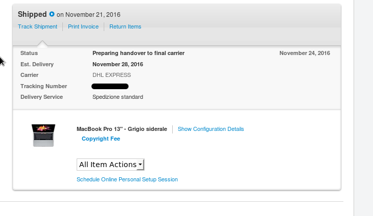 In meanwhile Apple at 23rd of November tried to charge my CC for a second time! And when I asked them about it they told me that at first my MBP was to be sent sooner but due to some internal decision that MBP was delivered to someone else and I got pushed back in the queue. - just great.