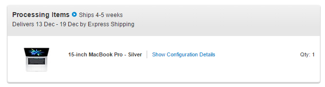 Ordered on Nov 15th, MBP 13" w/ TB. I haven't been charged yet, but should happen soon I hope. Delivery window was 20th -29th, now 19th - 27th (25th and 26th are public holidays in Germany).Which one did you order? Have you been charged?