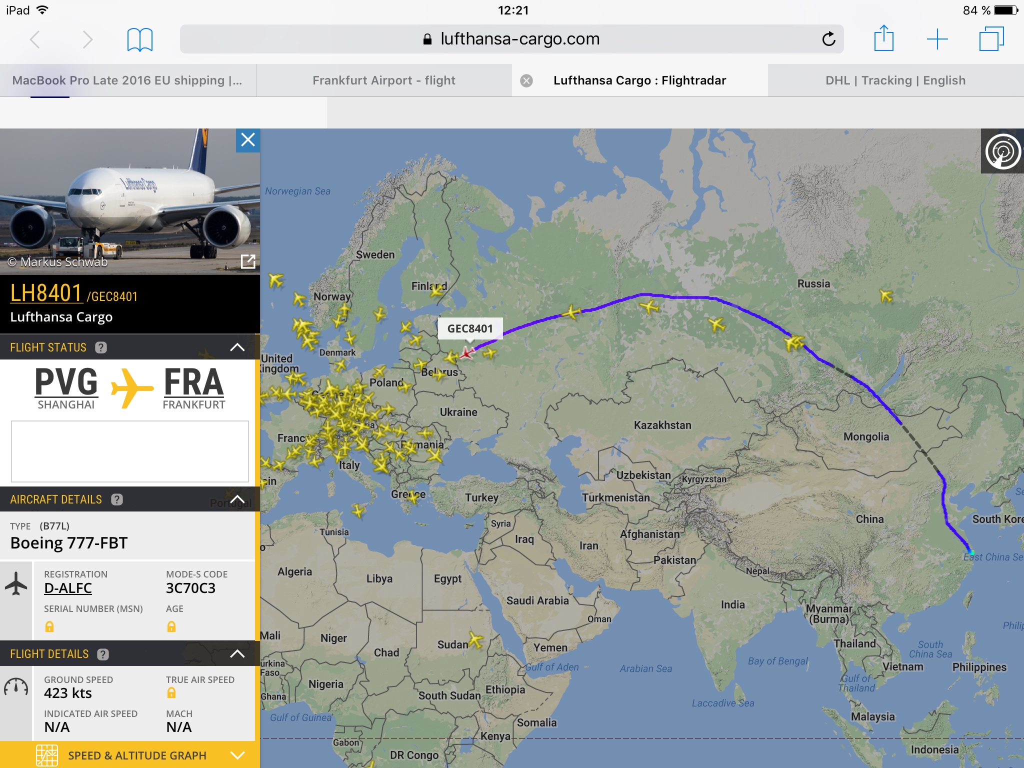 Possible delivery tomorrow? If they arrive in Eindhoven later today.So cargo flight to Frankfurt, Syncreon truck to Eindhoven, and DHL to us...