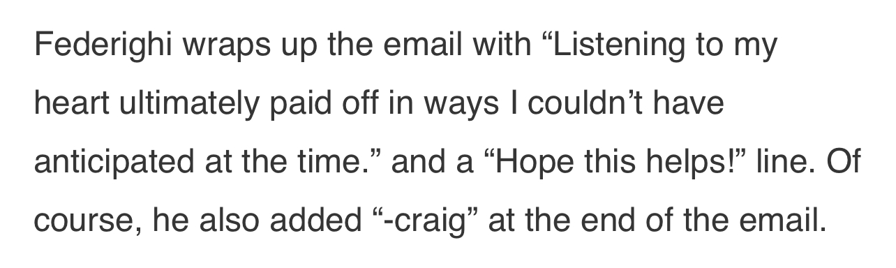 In all the screenshots of Craig emails his signature has a typo small 'c'. His real email account probably has no typo and has full signature. Small 'c' probably means assistant is answering.