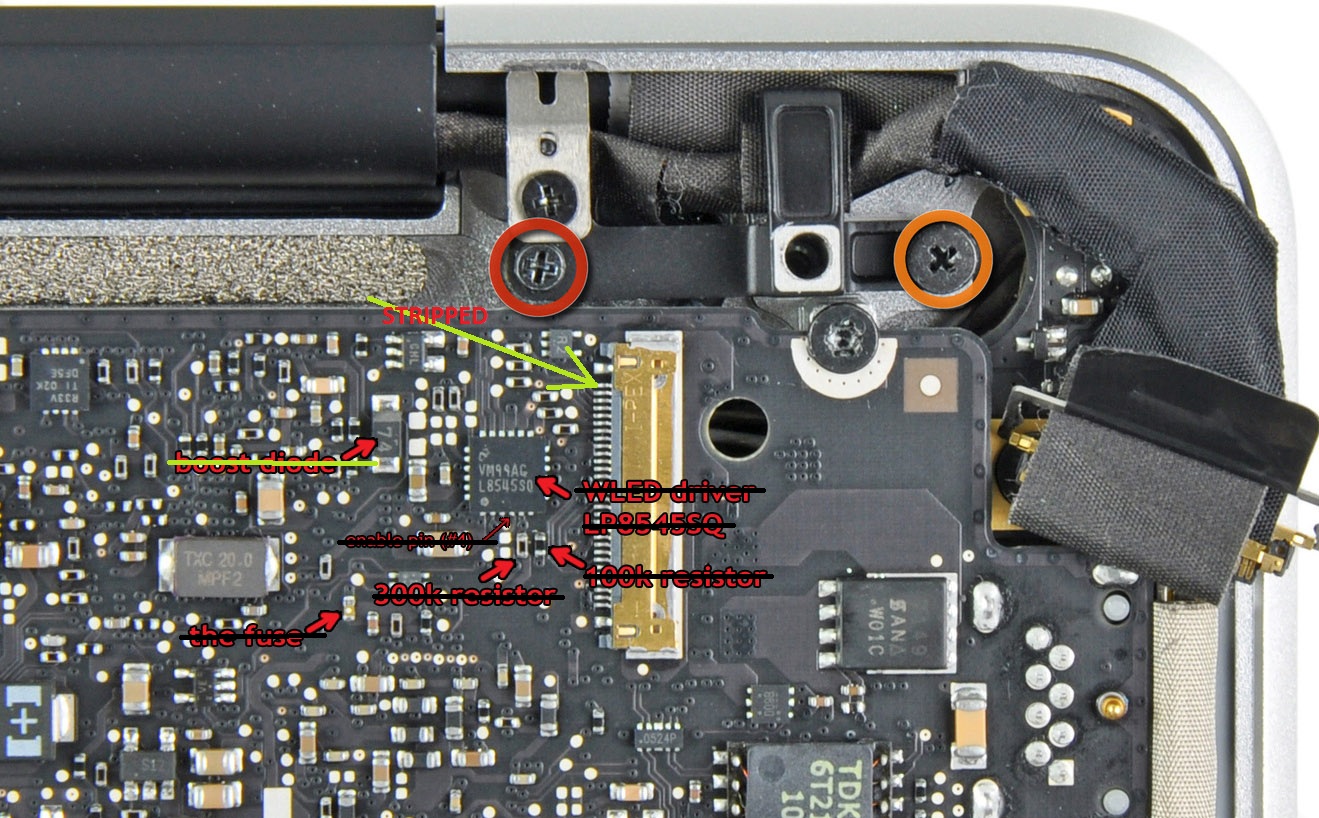 Hello, I recently bought a 17" Macbook Pro (a1297 Early 2011 model) that I was told had been water damaged. After cleaning the board the computer will charge off of the charger and will power on (with and without the power adapter in use) using the power button after I replaced the keyboard. The screen got broken somewhere along the way but it still displayed an image and the back light was working before I put the new screen in. After testing the new screen the back light was working but when I went to put everything back together the back light stopped working but I can tell that it is still displaying an image on the screen. I am not entirely sure where to start to figure out my problem. From reading through the post it seems like I can narrow it down to a problem with the WLED driver, the boost fuse for the back light, or an issue with the LVDS connector. (I have a new LVDS cable so I know the cable is not a problem, Ive tested both cables) If anyone could tell me where the WLED driver is and the fuse that would be a great as well as how to test each of the three possibilities of the problem. Here are links to high res photos of my board (you might need to use the zoom option located in the top right of the picture when you mouse over it):