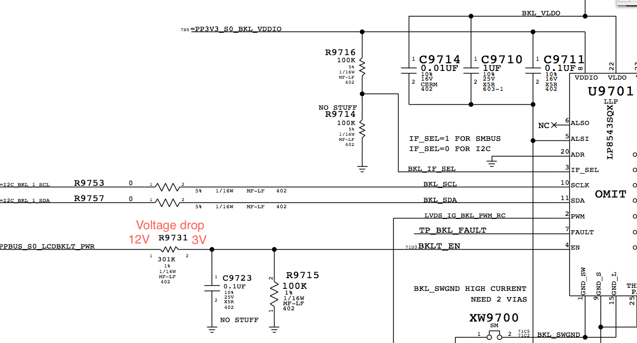 I have a Macbook with no backlight, already replaced the LP8543, the fuse is ok. The backlight only flashes for less the 1 sec when manually shutting down the Macbook. I found a voltage drop at the below marked resistor, the resistor itself is ok but the measured voltage before and after it is not the same. Would really appreciate any help!!