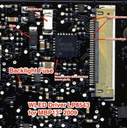 im a bit of a novice with this sort of thing but after reading through alot of this thread i sort of understand the parts to look for and ive tested the 2A fuse and the backlight voltage , both seem to be ok . i have continuity from the 2a fuse and i get reading from the backlight voltage which is leading me to believe its the WLED driver. The trouble im having is that im not sure how to test the QFN package for impedance to ground . if i do need to replace this i am willing to have a go myself (not the worst solderer in the world ) thats where i get lost ?? im not skilled with a mutimeter but i do have one lol can anyone help , ??