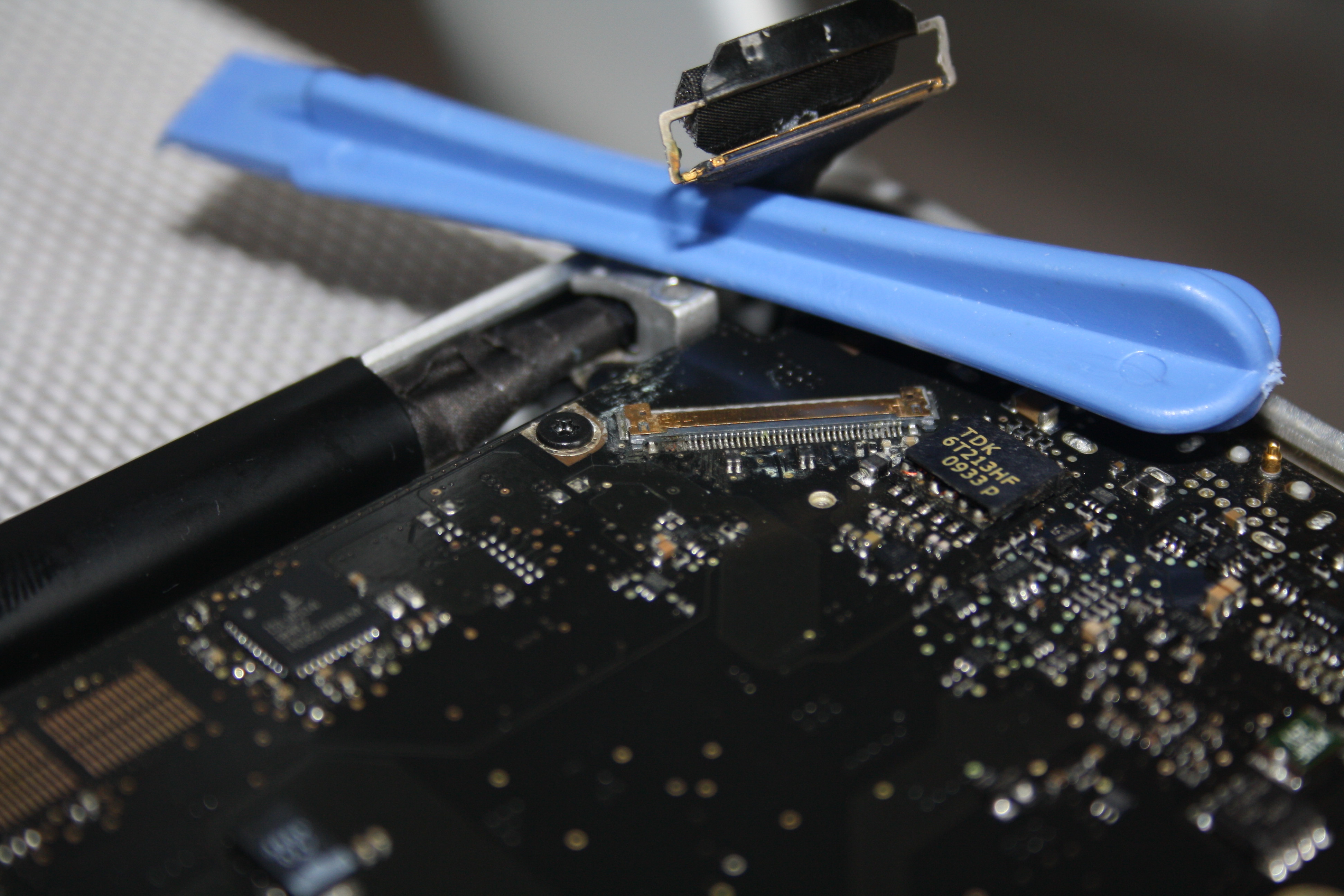 Unfortunately to fix my connector on the board I think I'll need a hot air rework station $150-$200, patience, steady hands and nerves of steel. Or else I'll have to send it out to an expert repair place on eBay. ANYONE HERE IN THIS LINE OF WORK? Fortunately, all the parts required, fuses, cables, connectors, are available on ebay or elsewhere. The "MacBook Pro spill resulting in melted connector, blown fuse, possibly bad backlight IC" seems to be a REALLY common outcome of any spill.