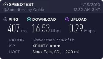 That's faster than I had last fall. While I was out of town they upgraded the entry-level service. Funny thing, they upgraded my bill, too.![]()