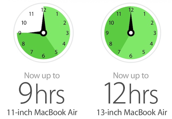 - Better battery life: With the new MacBook Air based on Intel's energy-efficient Haswell processors, Apple was able to boost battery life by up to 80%, with the 11-inch model's runtime increasing from 5 hours to 9 hours and the 13-inch model's moving from 7 hours to 12 hours.