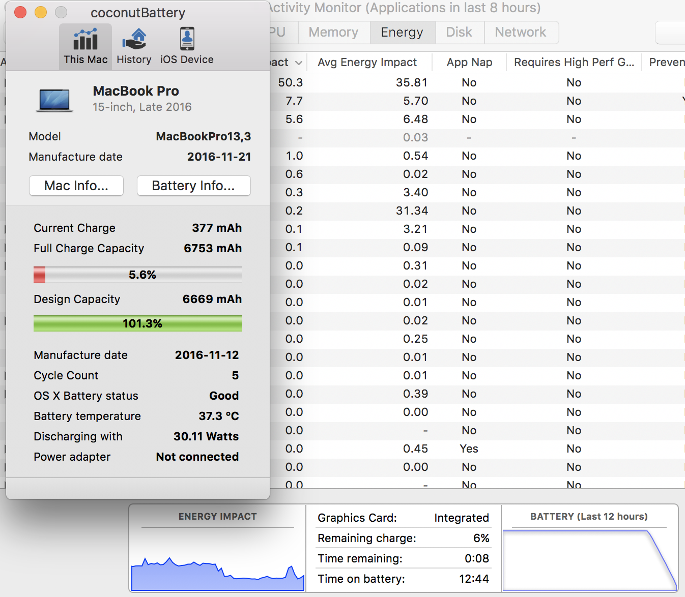 Once again, however, there are always claims to suggest otherwise. Reddit user Lebron Hubbard claims he received 5 hours and 48 minutes of battery life on his high-end built-to-order 15-inch MacBook Pro with Touch Bar when forcing only the dedicated AMD Radeon Pro 460 graphics to run using gfxCardStatus:Apple's built-in Activity Monitor and third-party app coconutBattery are useful tools for tracking system processes and detailed battery information.