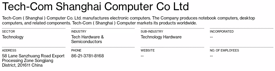 Tech-Com (Shanghai) Computer Co., Ltd. manufactures and markets computers and computer peripherals. The company is based in Shanghai, China. Tech-Com (Shanghai) Computer Co., Ltd. operates as a subsidiary of Quanta Development Ltd.